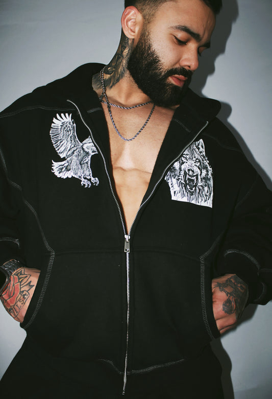 Contrast-Stitched Boxy Fleece Zip Hoodie